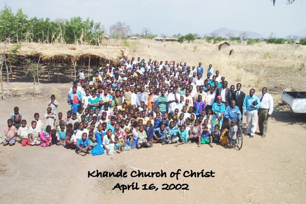 On Friday, August 16, 2002, Stephen Kasenda and I left Blantyre, Malawi and traveled 103 km east to the Khande church in Phalombe District for a meeting with brethren in the area. There were 5 baptisms this morning. Also, we were informed that another new congregation has been established in the area. The work is growing. This area of Phalombe is Stephen’s real home, the place where he was born and grew up. Of course, the wild animals that were around when Stephen was a child are gone. They have been replaced by people. As you can see, we had a good number to attend the meeting. Stephen is the man in the lower extreme right. Standing to his right is the preacher for Khande, Bro. J. Thamanga. The man to his right is the UDF party chairman who visited the meeting. The man to the chairman’s right, a tall man, is the village chief. The man in the handicapped cycle received the vehicle from the MAP (Malawi Against Polio) organization. If you look carefully at the children on the far left, you will see some have distended stomachs, the sign of malnutrition. In the distant background of the picture you can see a number of trees without leaves. These are the famous baobab trees--the upside down tree. They are called this because the trees look like the root system of an ordinary tree if you were to dig it up. --Jim Franklin |